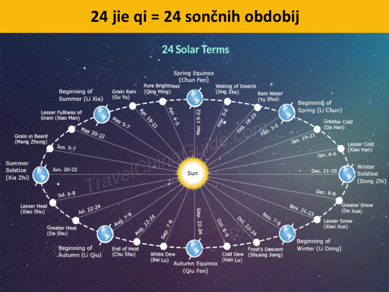 Stari Kitajci so gibanje sonca razdelili na 24 obdobij. Vsako sončno obdobje ima svoje ime, ki opisuje značilnost podnebja in procesov v naravi v naslednjih 14-ih dneh. Prvo sončno obdobje se imenuje Začetek pomladi, zadnje, štiriindvajseto, pa Veliki mraz. Sončna obdobja so vezana na kitajski lunarni koledar, ki ga Kitajci še vedno uporabljajo, seveda skupaj z gregorijanskim koledarjem.